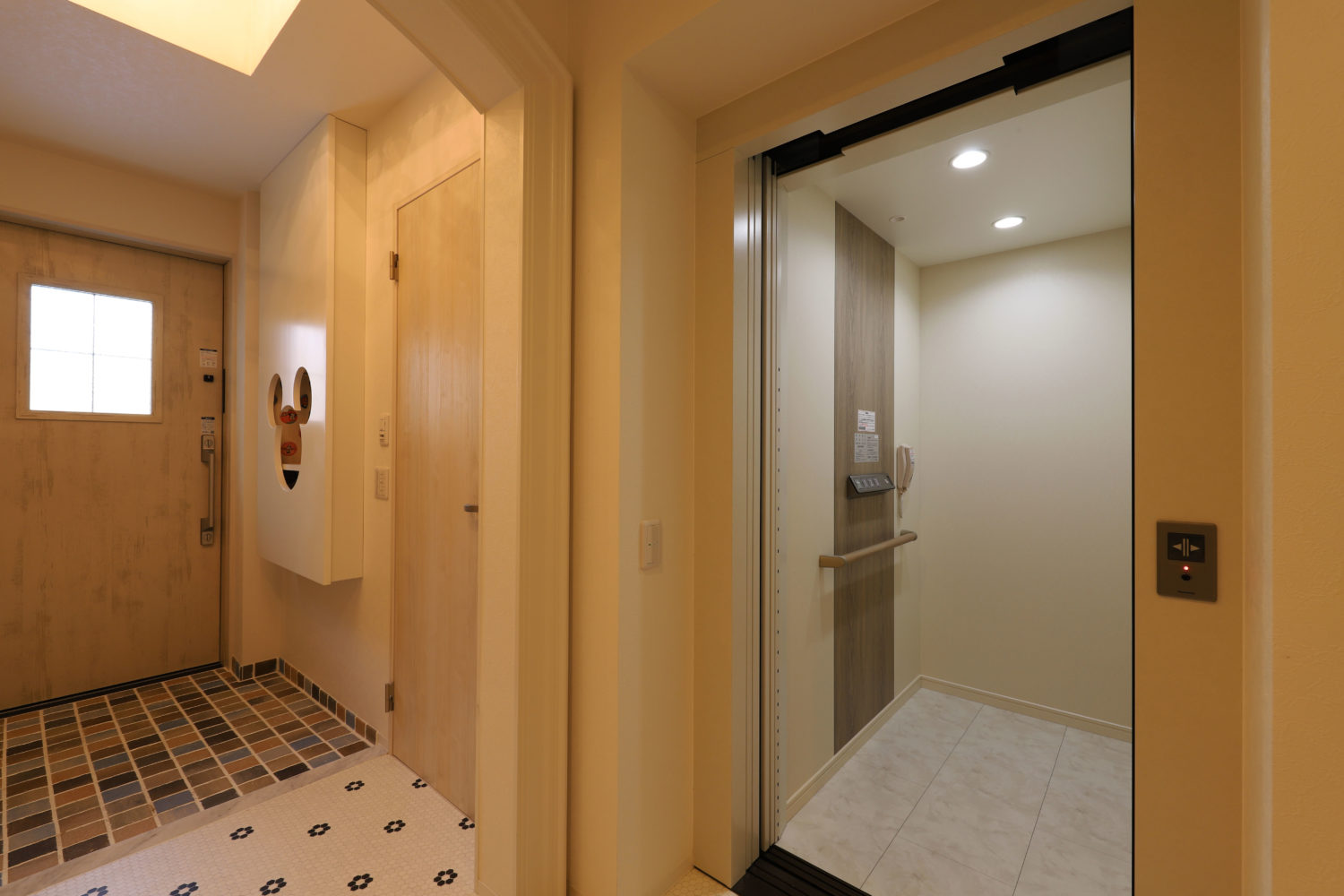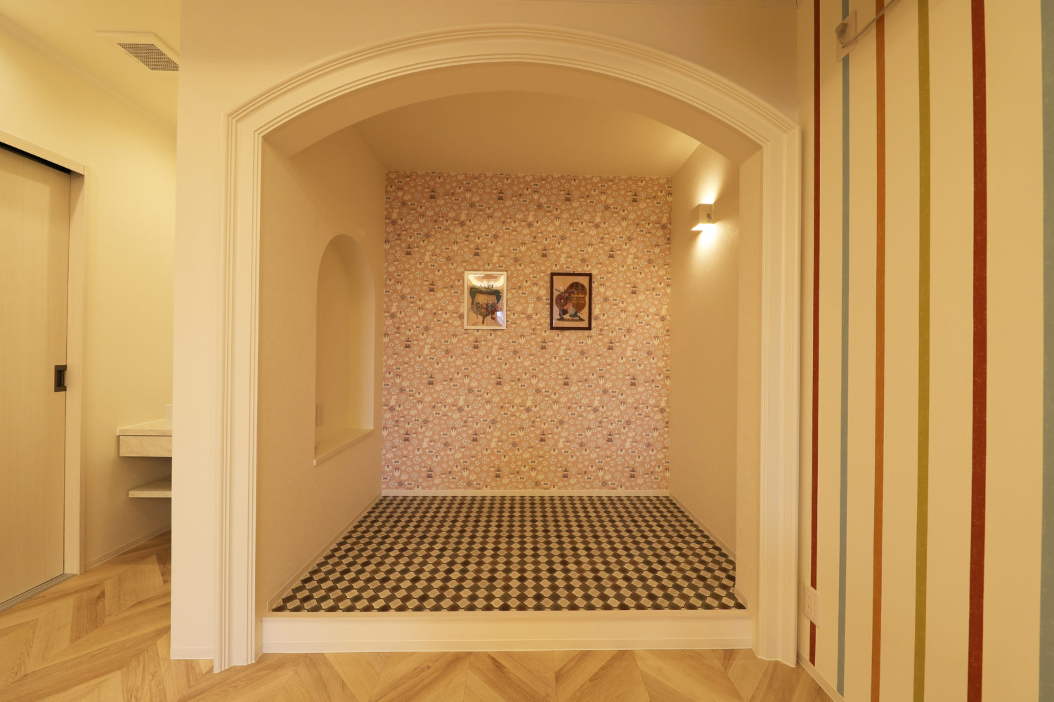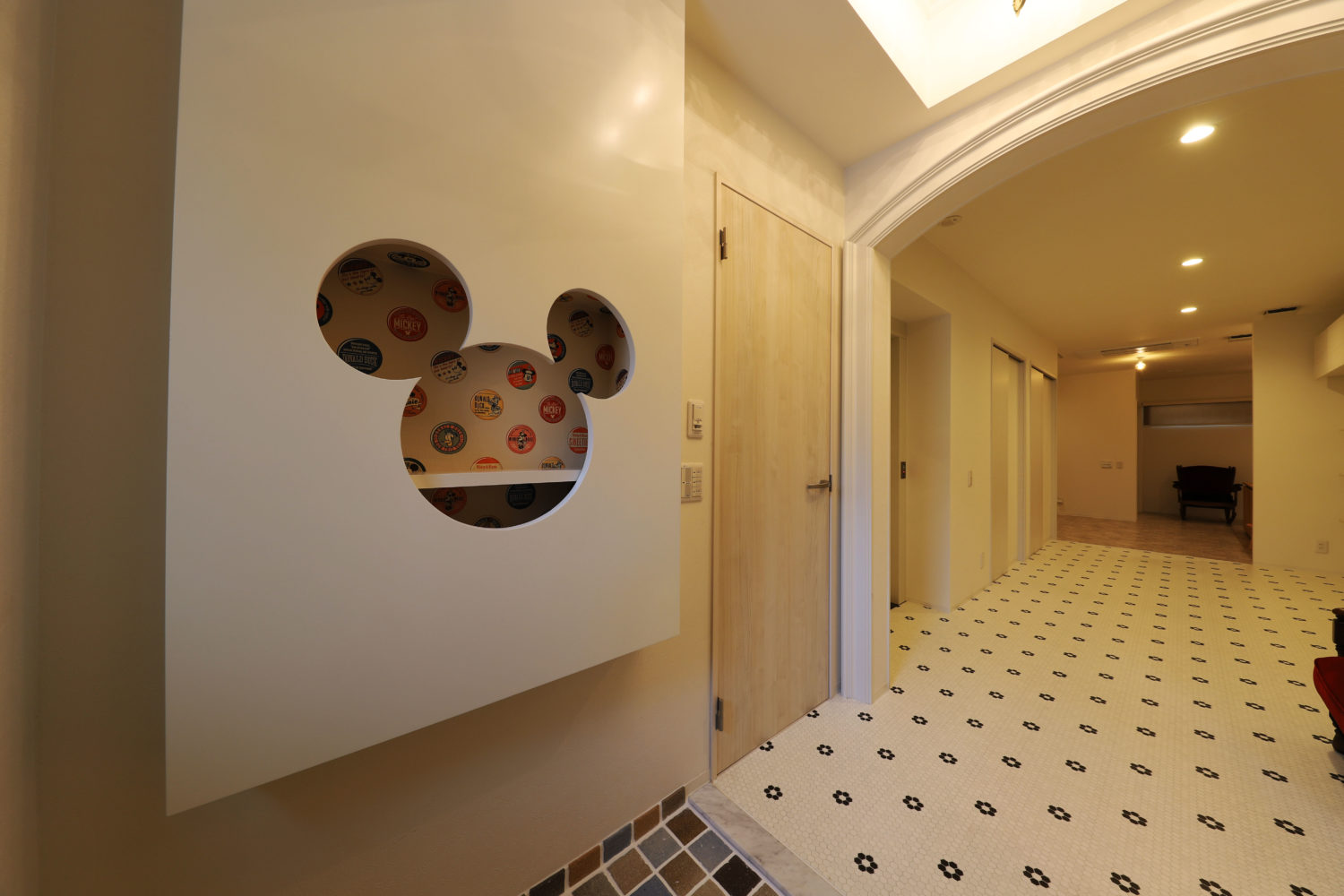 玄関のニッチにはミッキーマウスをモチーフにしたくり抜き加工を施し、さりげない遊び心を演出。また、2階・3階のアルコーブには、読書などをゆったりと楽しめる落ち着いた空間を設け、意匠性の高い廻り縁を採用することで上品なアクセントを加えています。