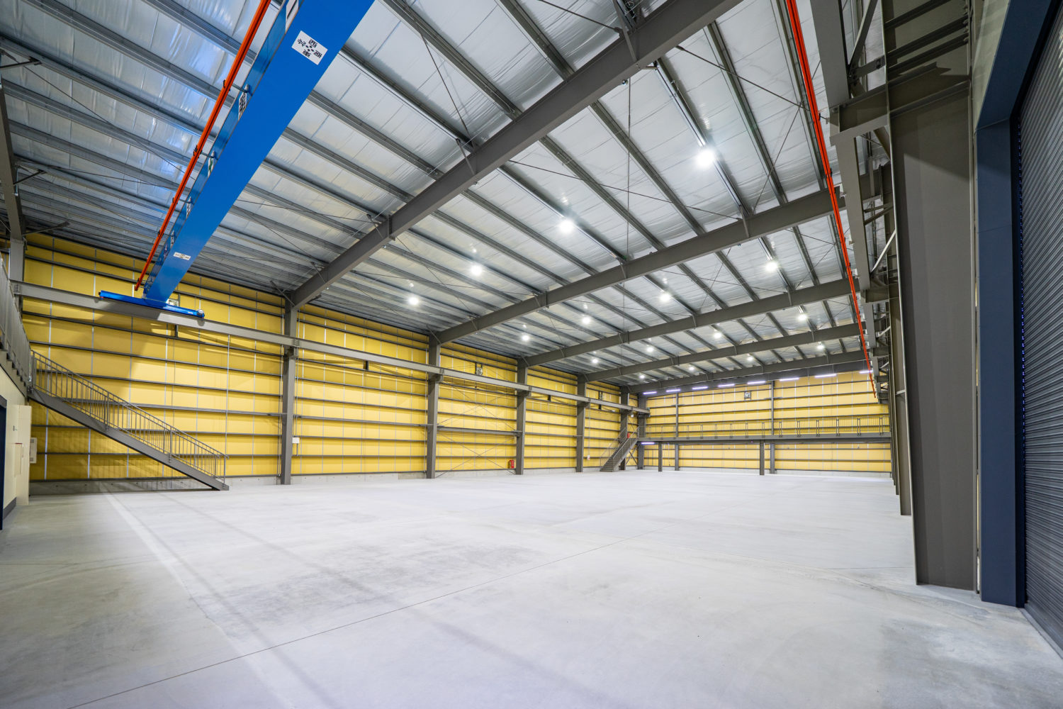 また、建物内にはクレーンを設置し、重量物の搬送・荷捌き作業に対応することで、作業性と安全性の向上を図っています。